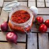 2. Wäh­rend­des­sen die Zwie­beln, die Chil­lies und den Knob­lauch fein hacken und in einer ofen­fes­ten Pfan­ne mit ein wenig Oli­ven­öl etwa 3 Minu­ten anbra­ten. Dann den hal­ben Bund Sal­bei grob hacken und eben­falls für etwa 1 Minu­te in der Pfan­ne anrösten.
