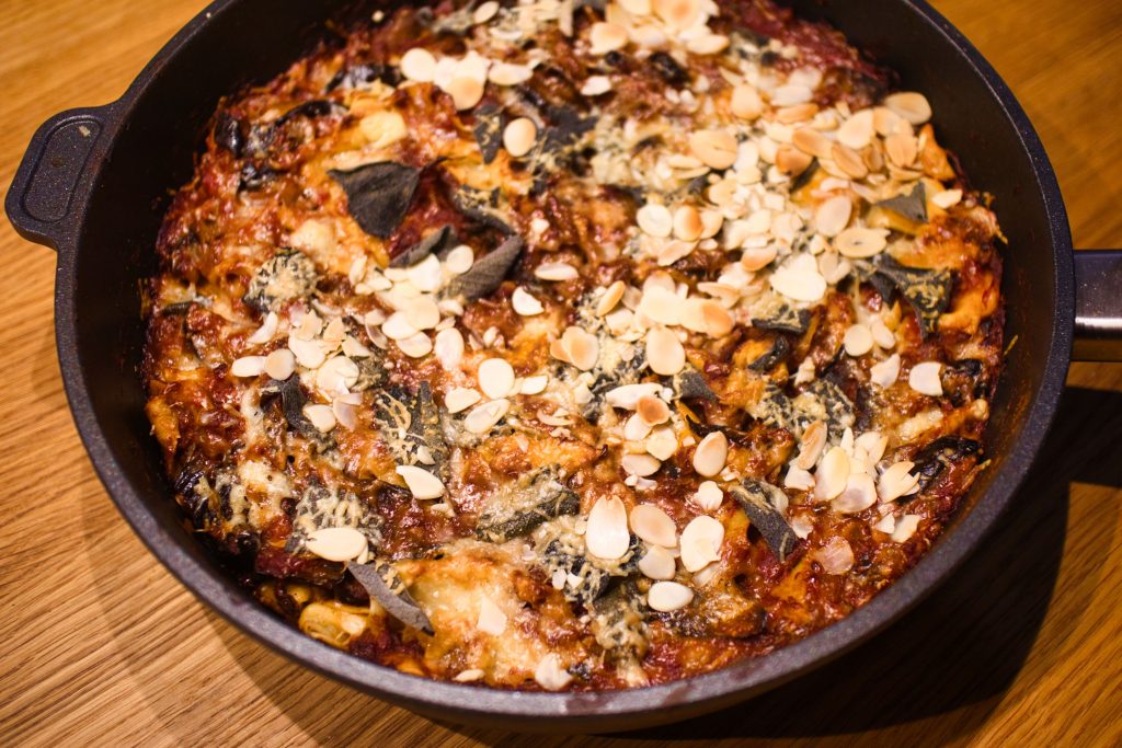 Die­ses Rezept haben wir auf Jamie Oliver’s You­Tube-Kanal ent­deckt und ziem­lich schnell aus­pro­biert. Das beson­de­re an die­ser Lasa­gne ist, dass sie nicht klas­sisch geschich­tet wird, son­dern die fri­schen Nudel­plat­ten in Stü­cke geris­sen und unter­ge­rührt wer­den. Natür­lich haben wir auch bei die­sen Rezept wie­der unse­re eige­ne Note rein­ge­bracht. Zum Bei­spiel schnei­den wir die Auber­gi­nen klein und garen sie erst­mal im Ofen vor. Denn es gibt nicht schlim­me­res als Auber­gi­ne, die nicht durch ist. Der Sal­bei in dem Gericht gibt dem gan­zen eine herr­lich medi­ter­ra­ne Note. Pro­biert die Lasa­gne unbe­dingt mal aus!