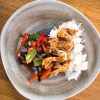 - Die Aubergine in 1–2 cm dicke Scheiben schneiden, salzen und einige Minuten Wasser ziehen lassen. Währenddessen die Paprika in mittelgroße Würfel, den Knoblauch in feine Scheiben, die Zwiebel in feine Halbringe und die Chillies klein schneiden. Die Petersilie hacken.