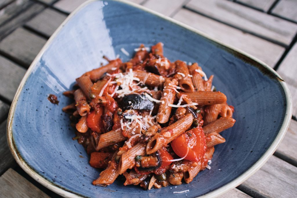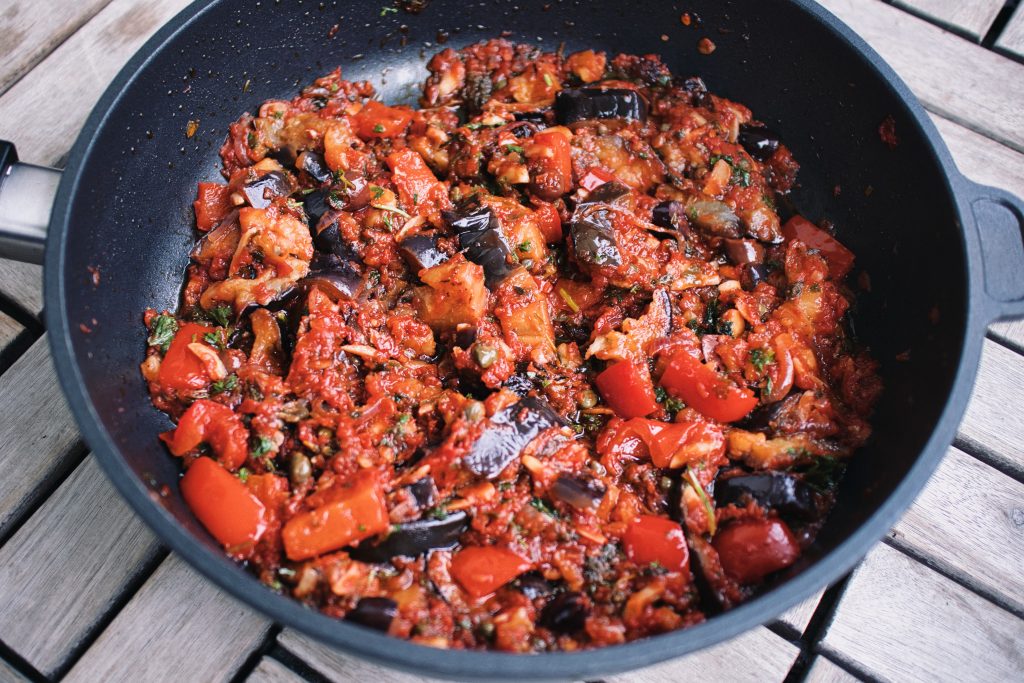 Eine Caponata siciliana ist echt vielseitig und sollte jeder einmal probiert haben. Sie eignet sich nicht nur als Nudelsoße, sondern schmeckt auch solo als Mezze sehr lecker. Eine weitere Idee, die ich mal mit einer Freundin gegessen habe, ist die Kombination mit einer mit getrockneten Tomaten und Mozzarella gefüllten Hähnchenbrust. Man kann sie sowohl mit frischen Tomaten als auch mit Dosentomaten machen. Ich bevorzuge die Kombination aus frischen Kirschtomaten und gehackten Tomaten aus der Dose. Auch super sind die Datteltomaten aus der Dose, die es z.B. von der italienischen Marke Mutti* gibt.