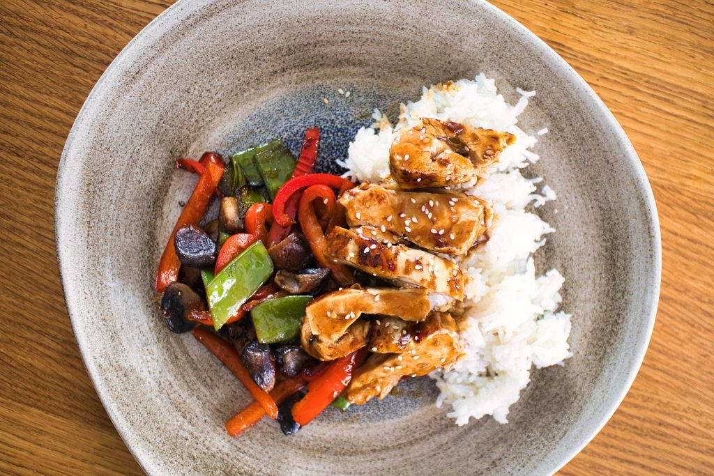 - Das Hähnchen in die Teriyaki-Sauce tunken, in Streifen schneiden und zusammen mit dem Reis und Gemüse sowie einem weiteren Löffel Teriyaki-Sauce servieren. Zusätzlich noch mit etwas gerösteten Sesam bestreuen.
