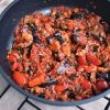 - Die Paprika und Zuckerschoten klein schneiden, die Pilze vierteln. Das Gemüse in die noch heiße Pfanne geben und ebenfalls bei mittlerer Hitze mehrere Minuten knackig anbraten.