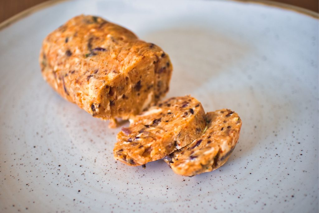 4. Danach die Mas­se in ein Gefäß geben oder auf einer Frisch­hal­te­fo­lie zu einer Rol­le formen.