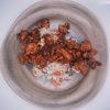 - Für das Fladenbrot Mehl, Backpulver und Salz in eine Schüssel geben und mit 100 ml Wasser zu einem klebrigen Teig kneten. Alternativ könnt ihr auch alles in eine Küchenmaschine geben und kneten lassen. Den Teig bis zur weiteren Verwendung beiseite stellen.