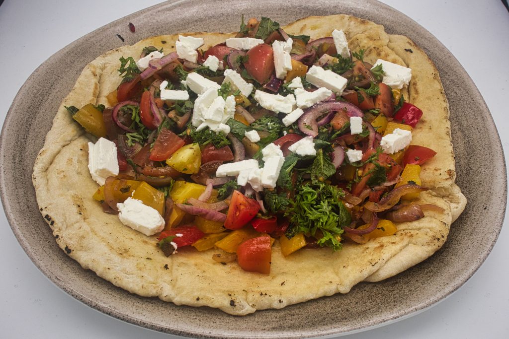 - Zum Servieren die Fladenbrote auf einem Teller anrichten und die geschmorte Paprika darauf verteilen. Den Tomaten-Kräuter-Salat und abschließend den Feta darüber geben.
