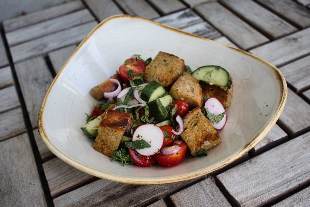 - Zum Schluss das Brot in die Schüssel zu dem Salat geben und das Dressing darüber verteilen. Kurz alles mit dem Salatbesteck vermengen und einen weiteren halben EL Sumach darüber verteilen. Bei Bedarf noch ein wenig Salz, Pfeffer, Zitronensaft und Öl nachgeben.