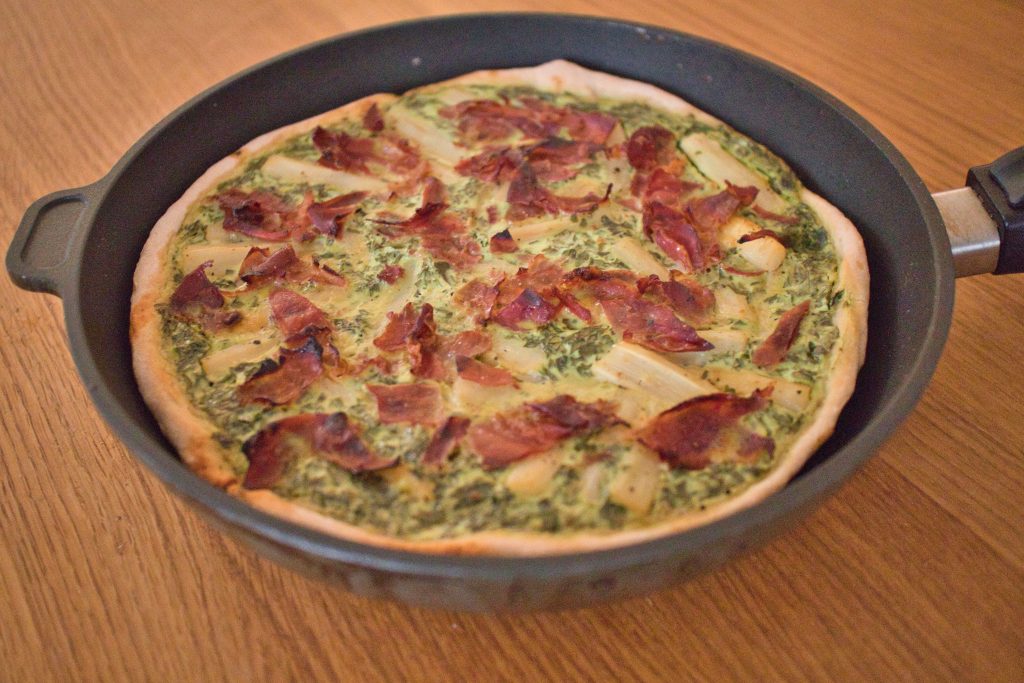 5. Nach­dem der Teig gegan­gen ist, ihn noch­mals kurz durch­kne­ten und dann mit einem Nudel­holz auf Grö­ße der Pfanne/Form aus­rol­len. Die ofen­fes­te Pfan­ne mit etwas Oli­ven­öl bestrei­chen und den Teig in die Pfan­ne legen. Mit den Hän­den einen etwa 1 cm hohen Rand for­men. Die Bär­lauch-Sah­ne-Mischung auf den Teig geben und dann sowohl den Spar­gel sowie den Schin­ken dar­auf verteilen.