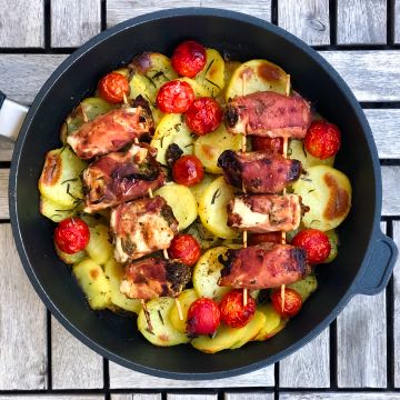 Italienische Hühnchenspieße mit ofengeschmorten Kartoffeln und Tomaten